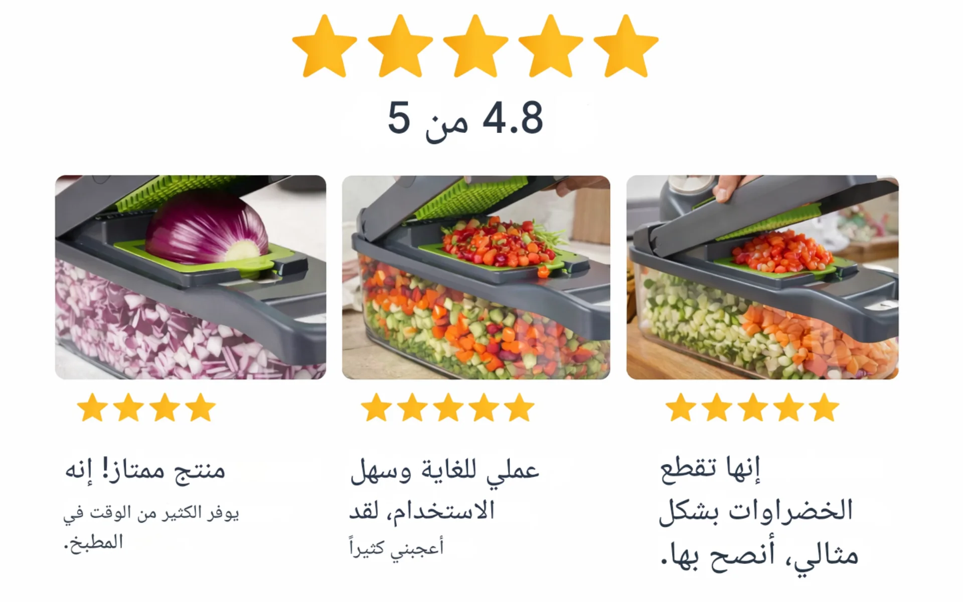أجزاء خفيفة الوزن وآمنة للغسيل في غسالة الصحون تجعل هذه القطاعة مثالية للأمهات المشغولات والطهاة المنزليين والطهي الصحي اليومي. قاطع الخضار – مصمم بشفرات فولاذية حادة لقطع حتى أقسى الخضروات بسهولة.